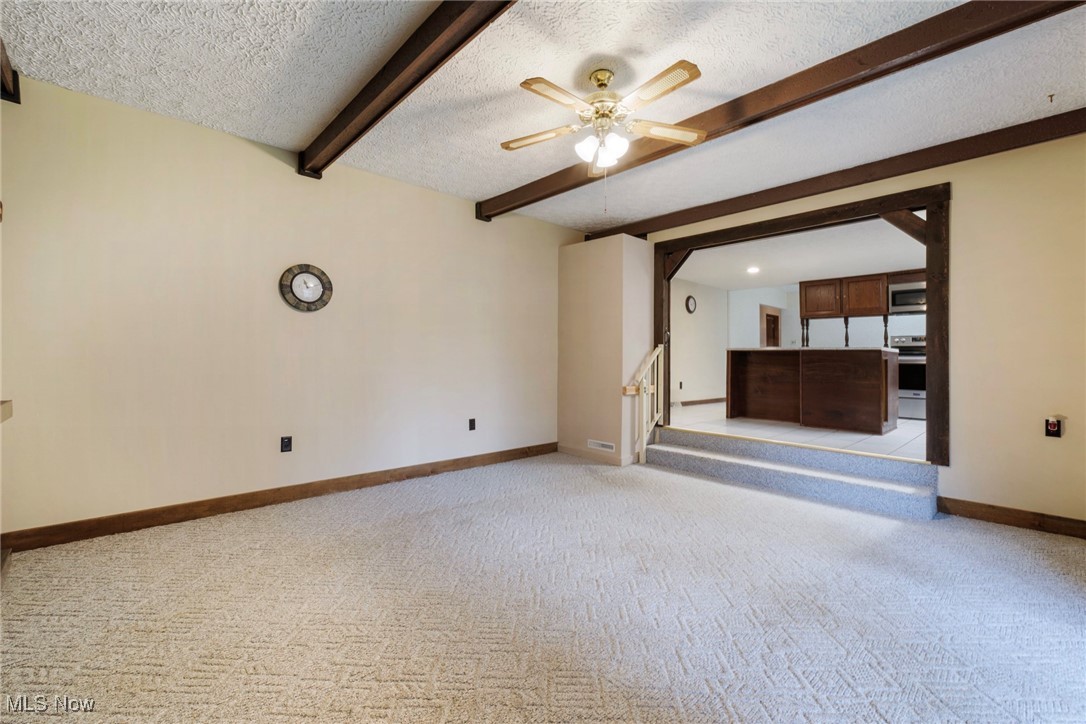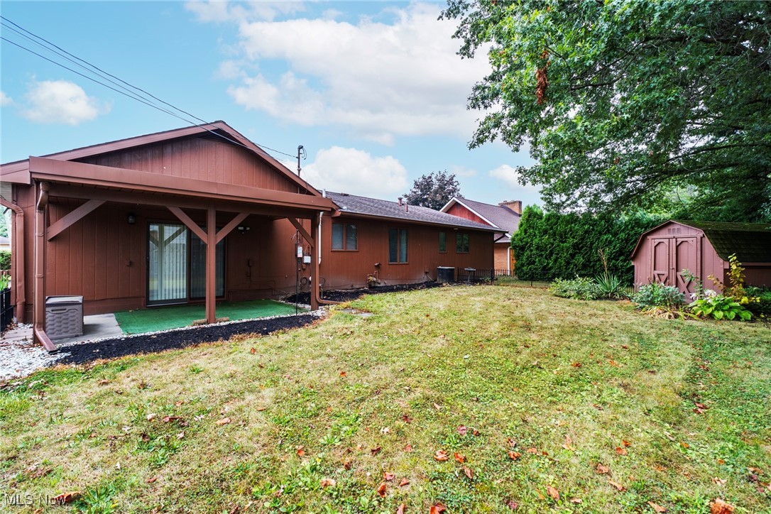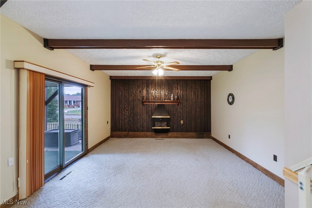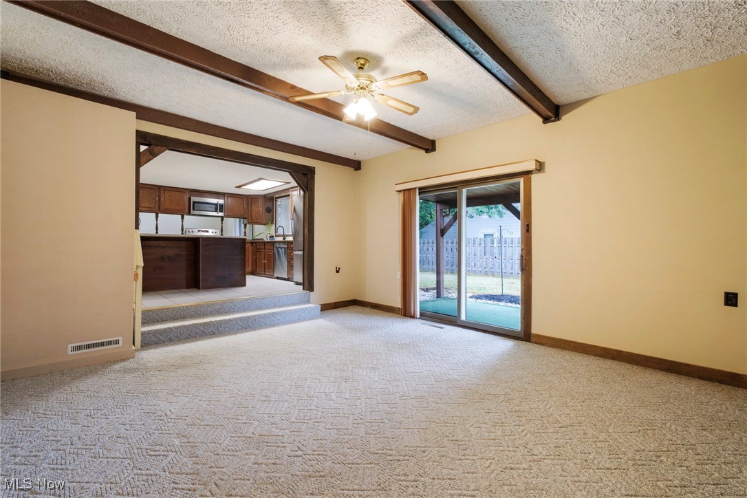 Step down into the inviting sunken family room, complete with a faux fireplace, striking wood beams, and sliding glass doors that lead to a covered patio overlooking the cozy backyard. The yard is fenced for small pets and includes a wood shed for extra storage.