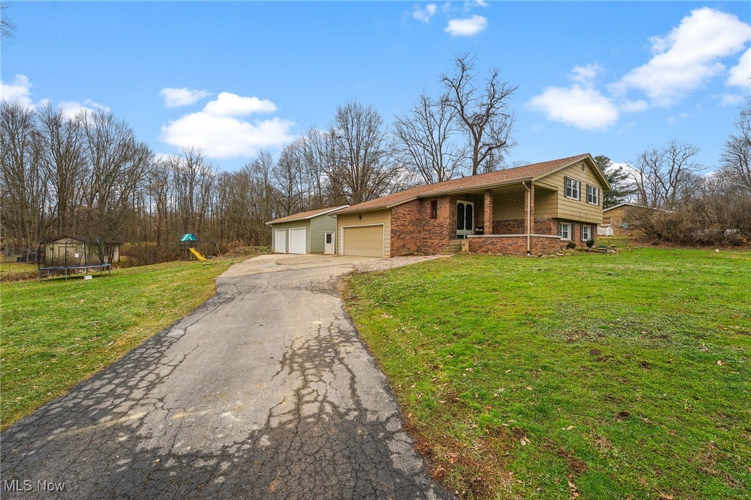 Welcome to 2974 Schotten Rd., a well-maintained bi-level home located in Hubbard Township within the Hubbard School District, offering space, functionality, and recent updates throughout. This property features a rare 4-car garage setup with two attached and two detached bays, perfect for vehicles, storage, or hobby space. The inviting front porch leads into a welcoming foyer that opens to a bright vaulted-ceiling living room with comfortable carpeting. The living area flows seamlessly into the dining space, creating an ideal layout for everyday living and entertaining. The kitchen, while a separate space, remains well connected and offers wood cabinetry, laminate countertops, stainless steel appliances, and a breakfast peninsula providing additional seating for an eat-in option. The upper level includes two generously sized bedrooms, both featuring newer carpet and double closets, along with a full bathroom complete with a stylish vanity, tub, and tiled walls. The lower level expands the living space with two additional bedrooms, also offering newer carpet and double closets, plus a second full bathroom featuring a tub surround and vinyl plank flooring. A dedicated laundry and storage area adds convenience and functionality. Major updates include a dimensional shingle roof (2020), vinyl windows (2015), and a new septic system (2025). Additional features include a 200-amp electrical panel, 80-gallon hot water tank, Kinetico water treatment system, and reverse osmosis for enhanced water quality. This property delivers a thoughtful layout, key mechanical upgrades, and ample garage space, all in a desirable location. A great opportunity to own a solid, move-in-ready home with room to grow.