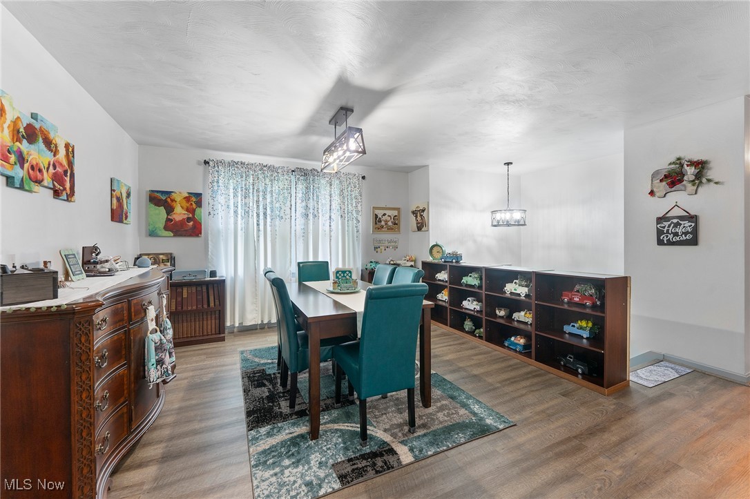 The main living area is currently set as a large dining space with a statement light fixture perfect for hosting. A second living room sits at the back of the home within the rear addition, offering ample space, and access to a generous back deck overlooking the yard.